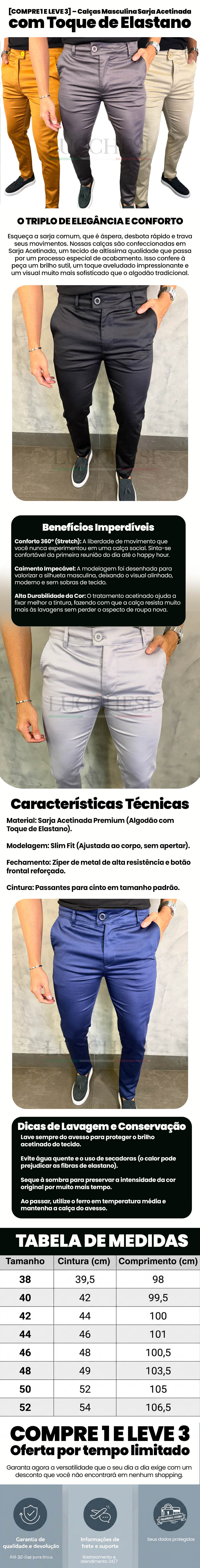 [COMPRE 1 E LEVE 3] – Calças Masculina Sarja Acetinada com Toque de Elastano